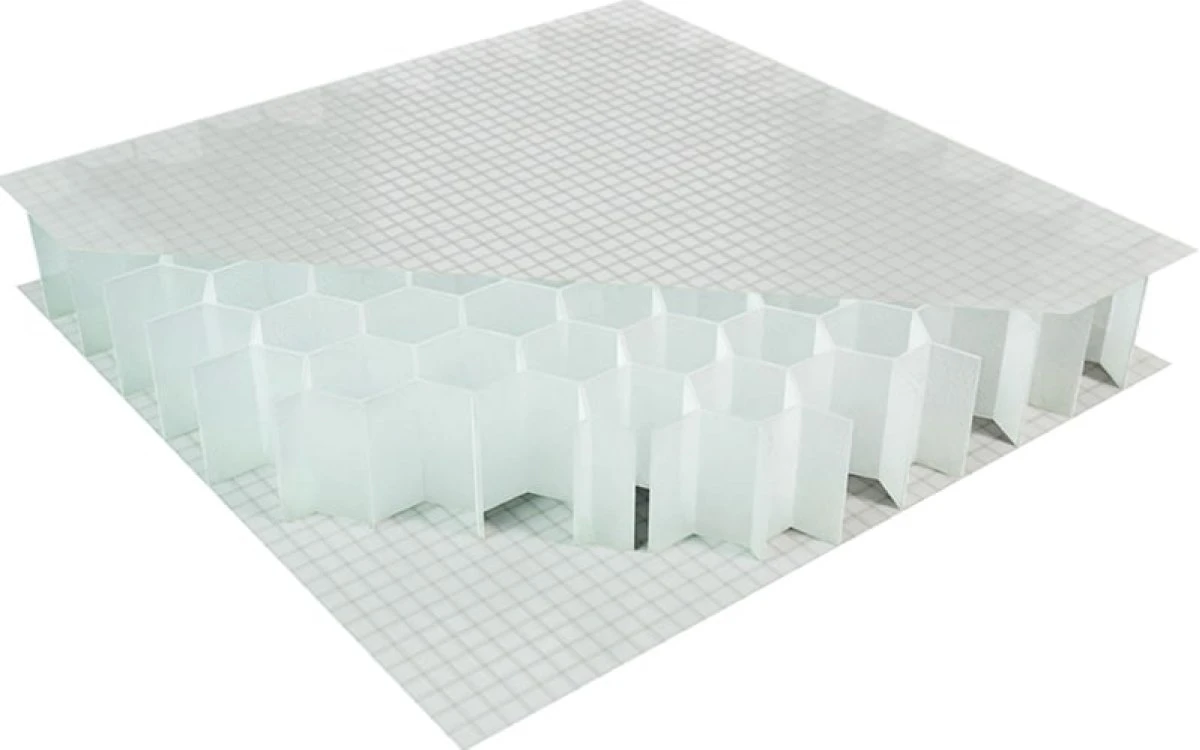 Los paneles compuestos FPH son muy ligeros, están compuestos por un núcleo de panal de polipropileno recubierto externamente con dos capas de fibra de vidrio impregnadas de adhesivo epoxi estructural.